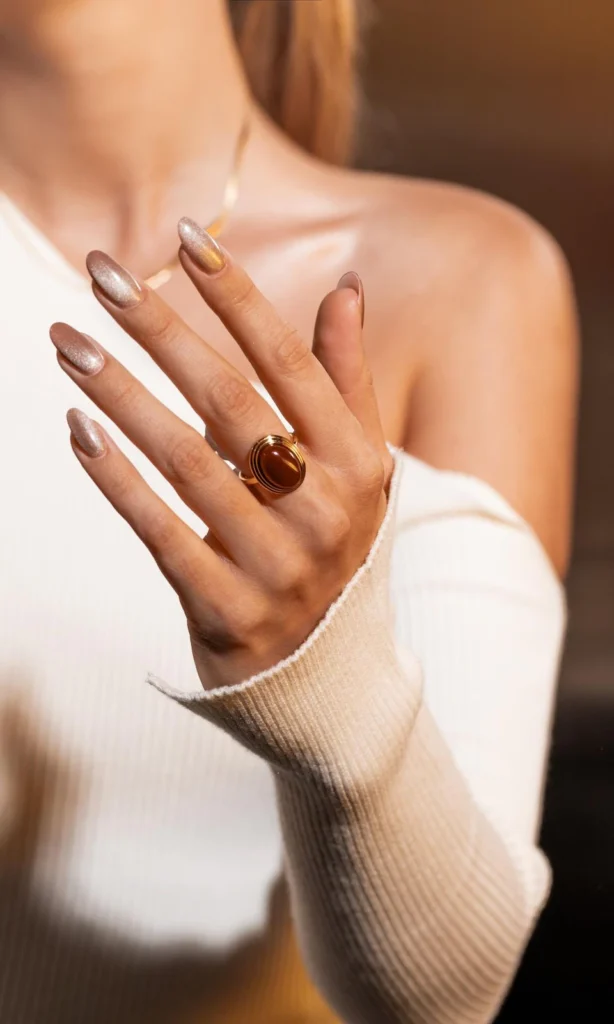 El esmalte con efecto magnético “ojo de gato” ha llegado para quedarse. Este diseño, que atrae miradas por su brillo único, también puede encontrarse en tonos neutros, permitiendo que quienes prefieren estilos más discretos disfruten de su sofisticación.